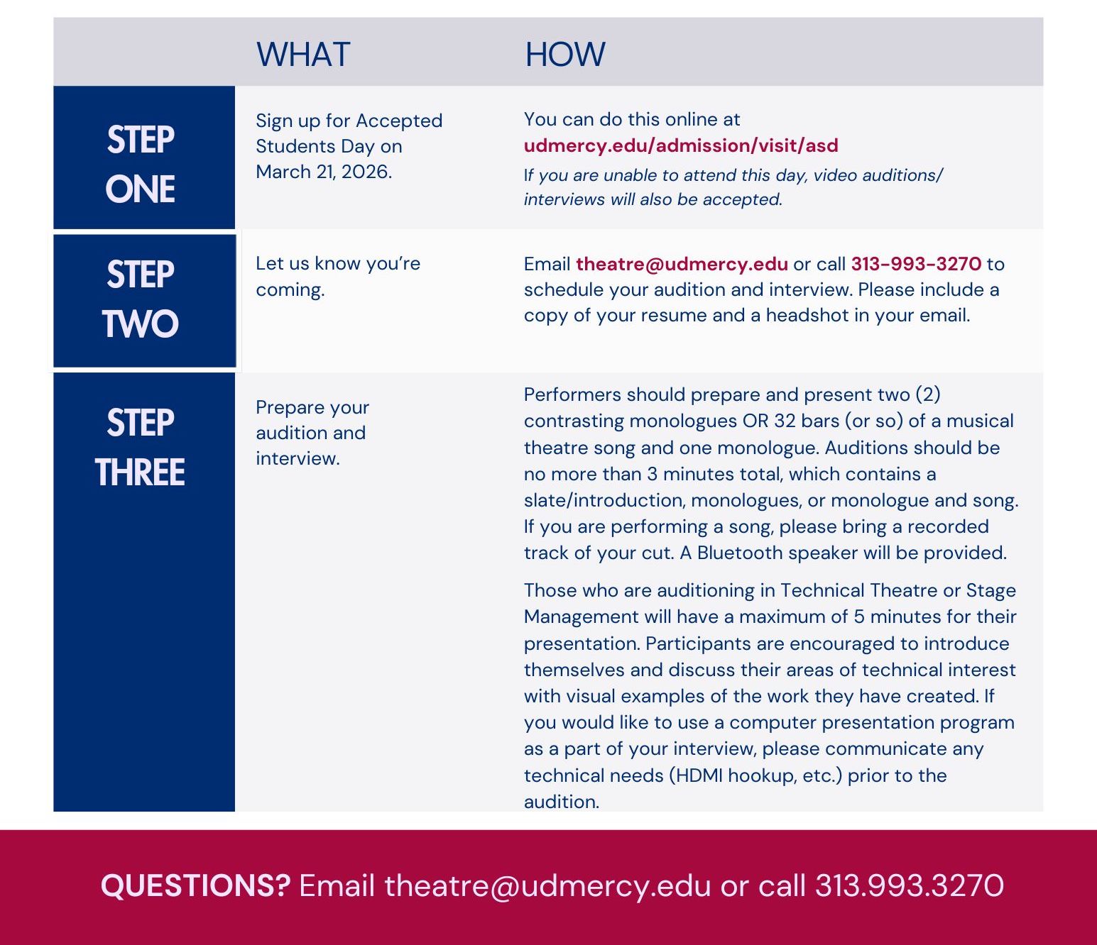 - Must apply and be accepted into Detroit Mercy to major in Theatre by March 1, 2026.